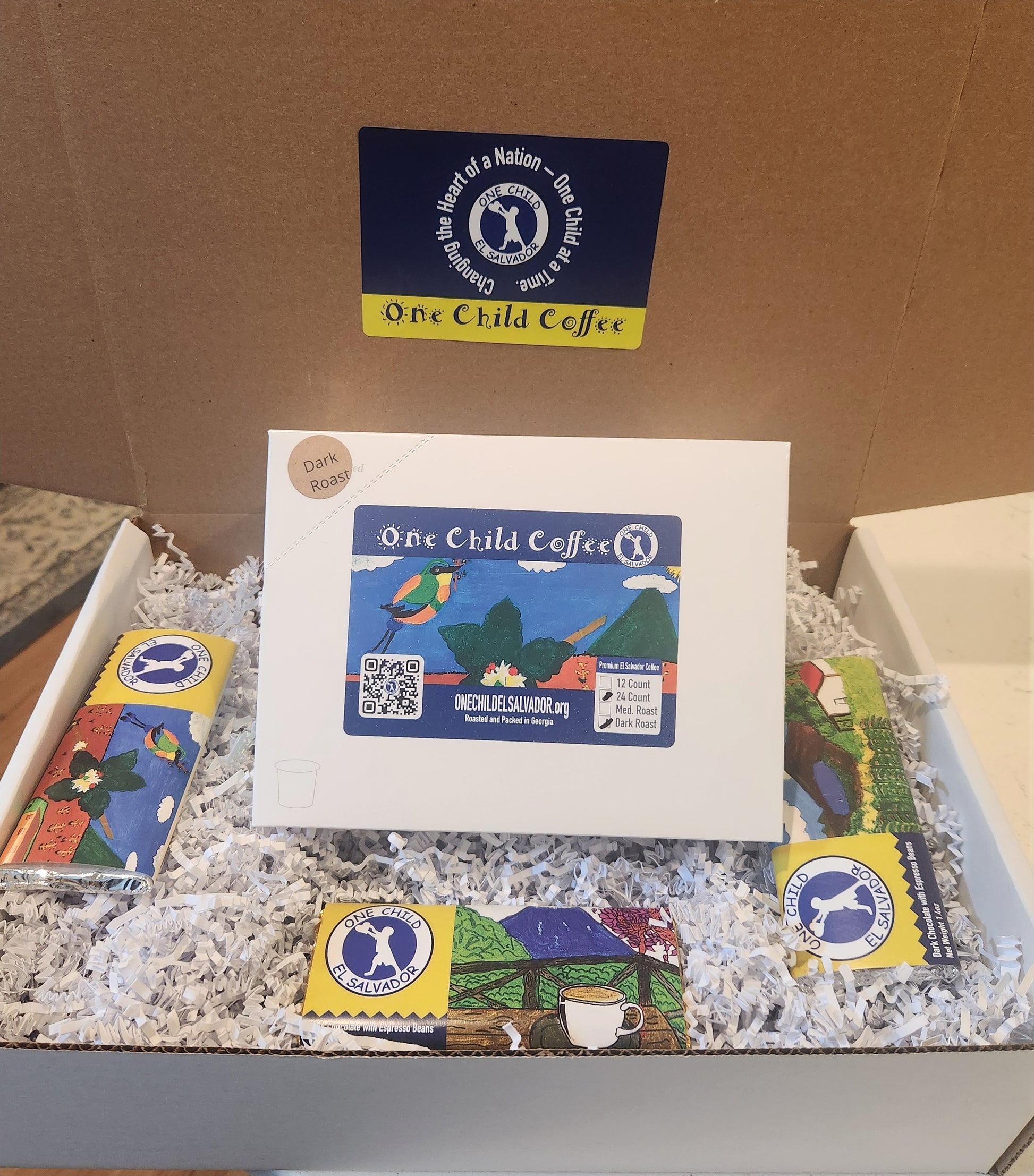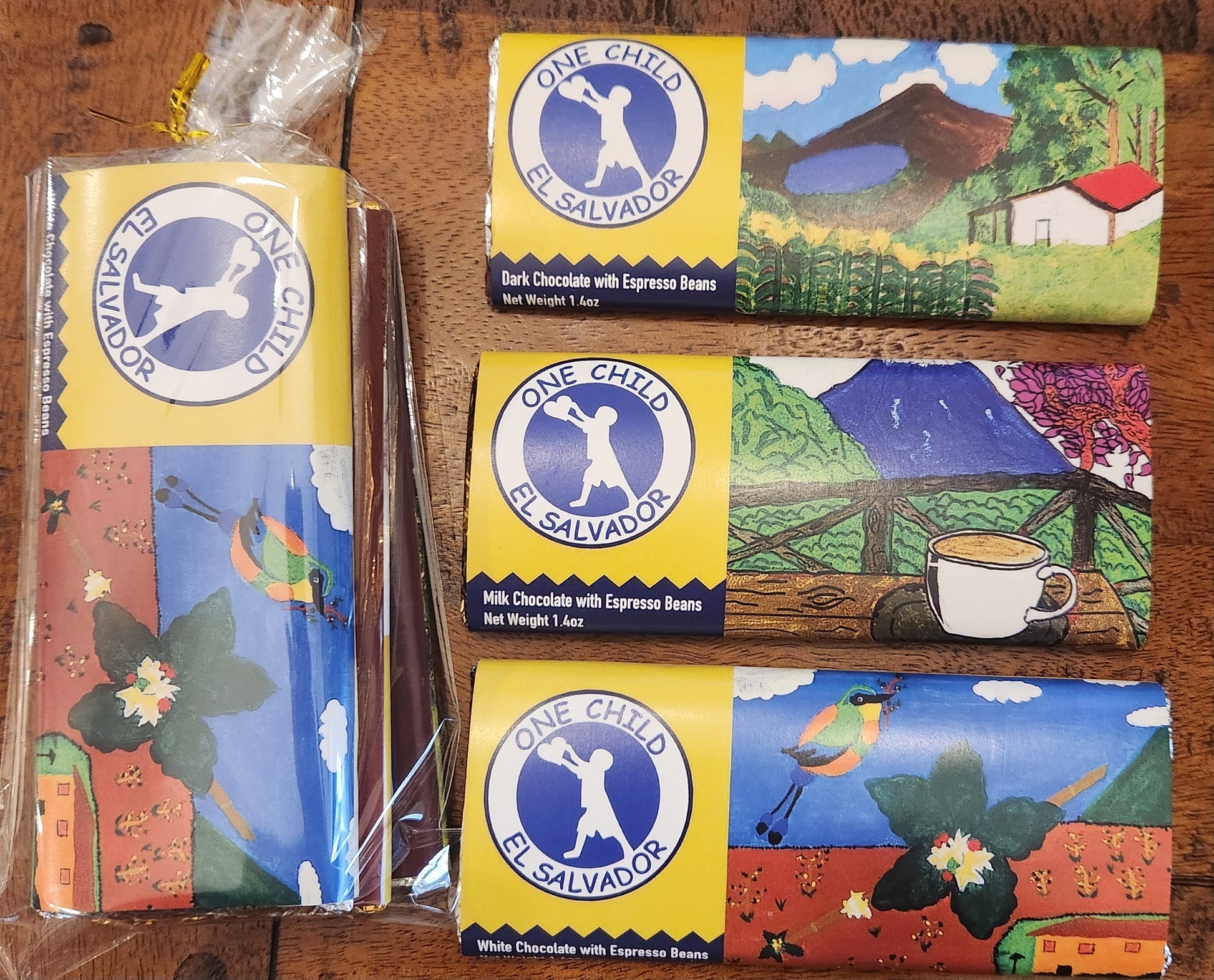 Both sets include three Paul Thomas Chocolates β Dark Chocolate, Milk Chocolate, and White Chocolate β each infused with our One Child Coffee Espresso Roast Beans. Every bar is wrapped in a unique design featuring artwork by the children of La Magdalena Christian School in El Salvador.